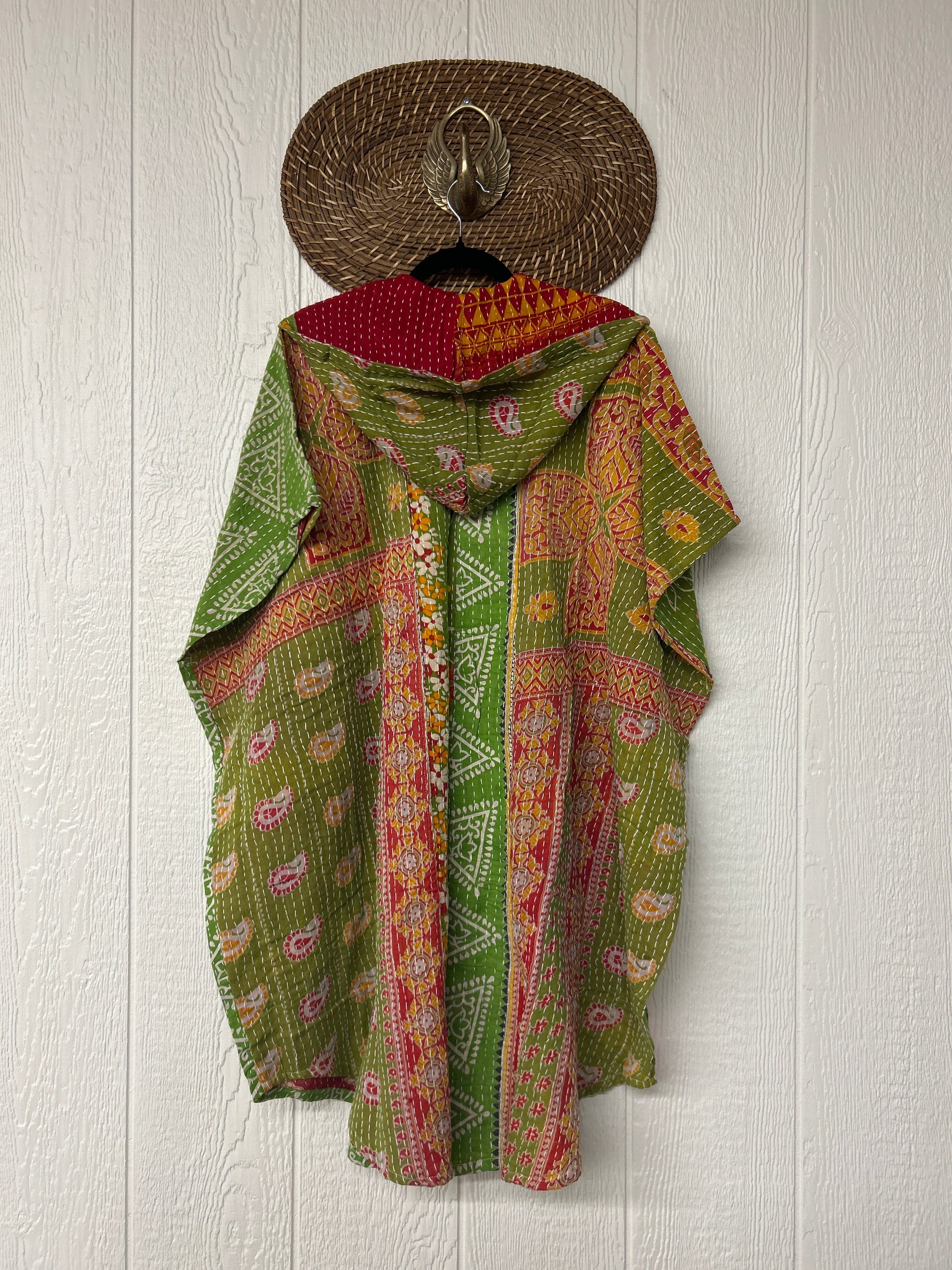 Made from our hand Kantha stitched cotton sari, this one piece wonder features a hood, front button-down closure, pockets, and super flowy shorts. Size Recommended 00-20/22. Crafted and sewn by families in a small village in Northern India, providing work and a fair living.