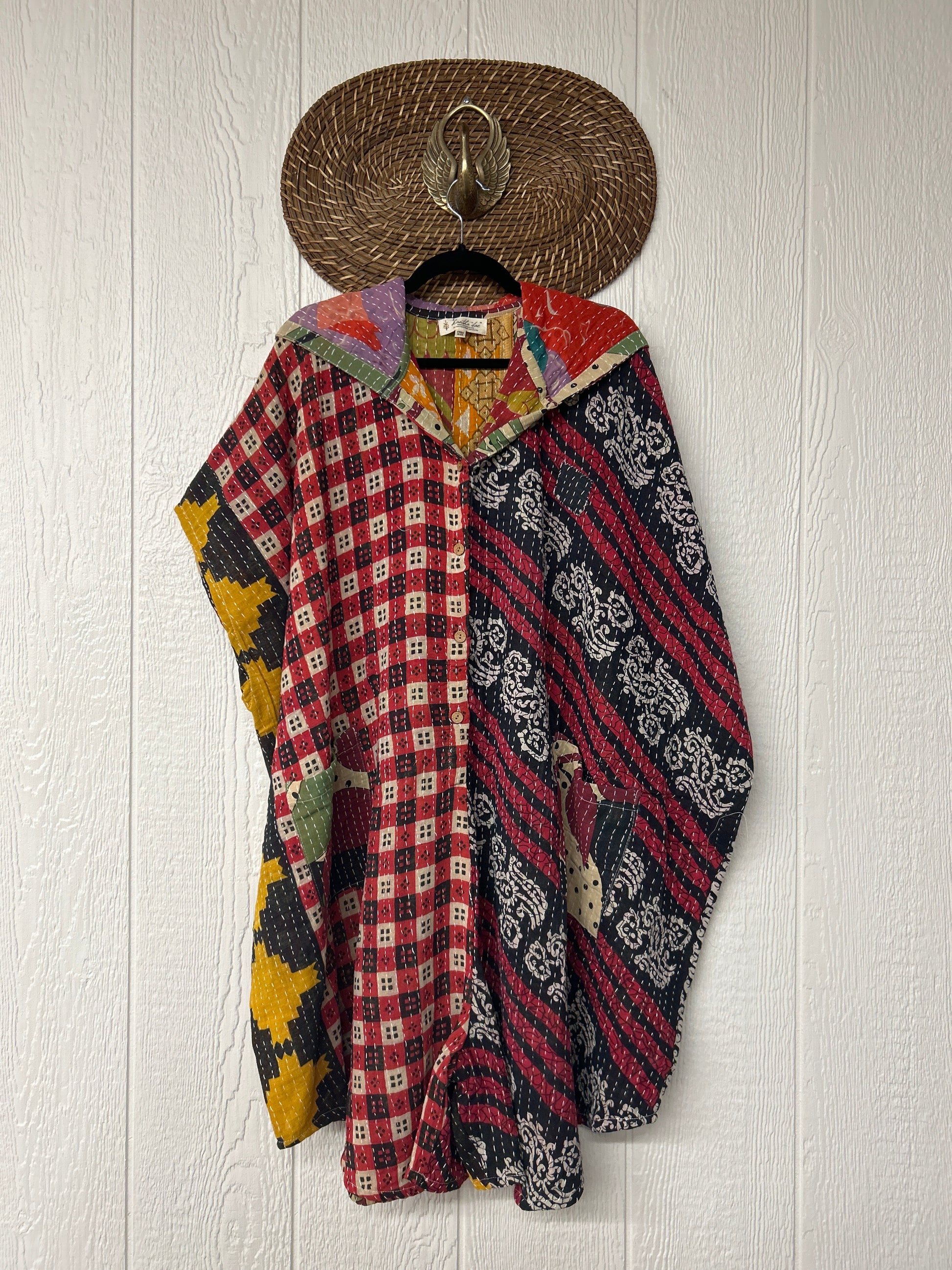 Made from our hand Kantha stitched cotton sari, this one piece wonder features a hood, front button-down closure, pockets, and super flowy shorts. Size Recommended 00-20/22. Crafted and sewn by families in a small village in Northern India, providing work and a fair living.