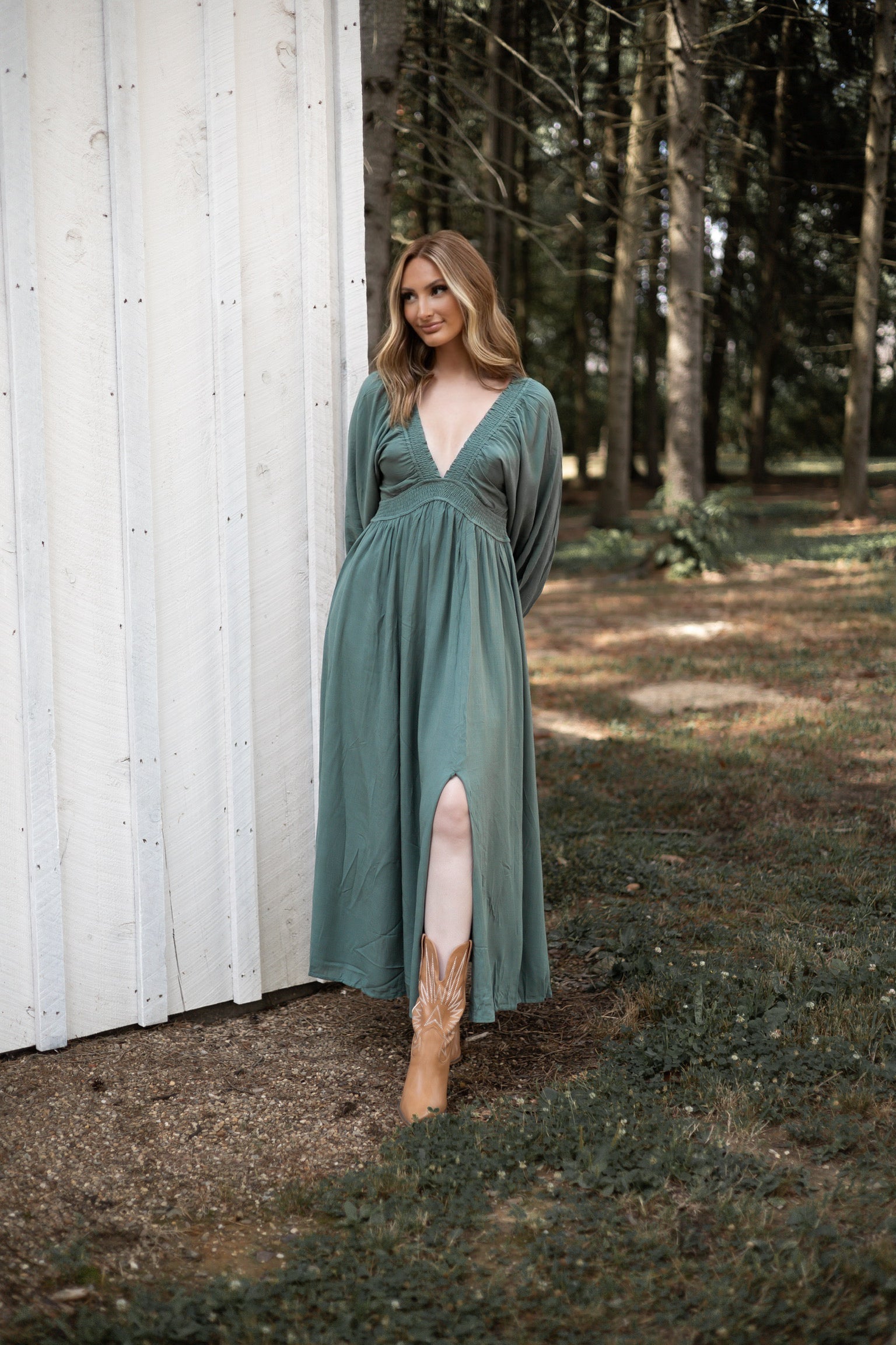Long dress with deep V neckline, ruching at waist and neckline, exaggerated batwing sleeves with elastic at cuffs, fully lined