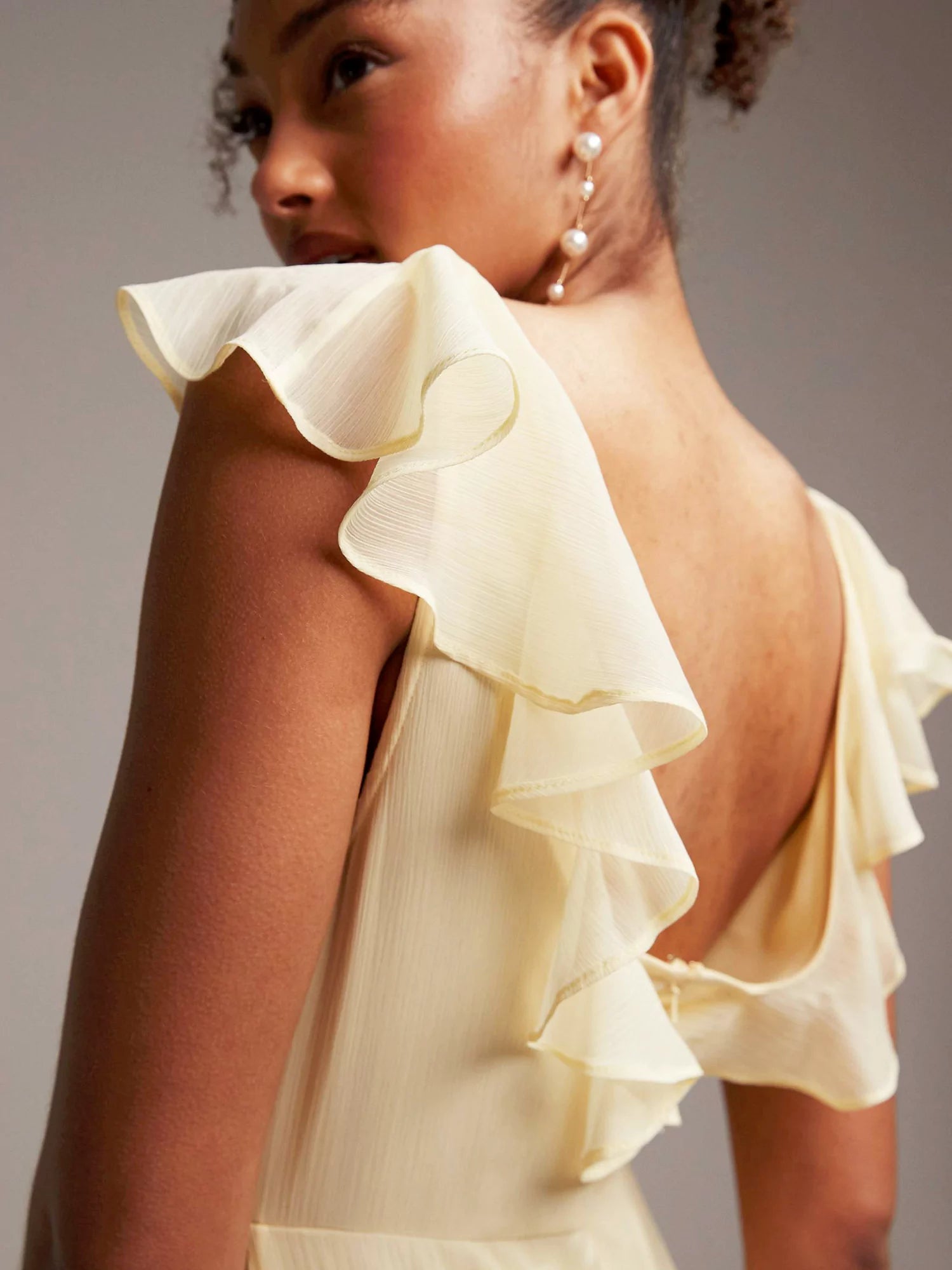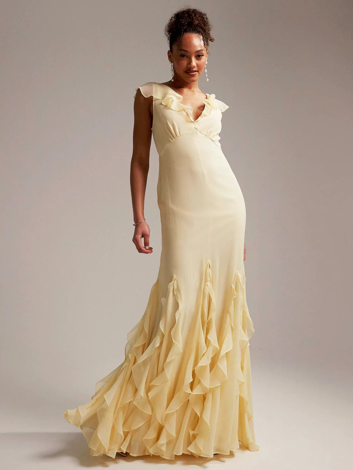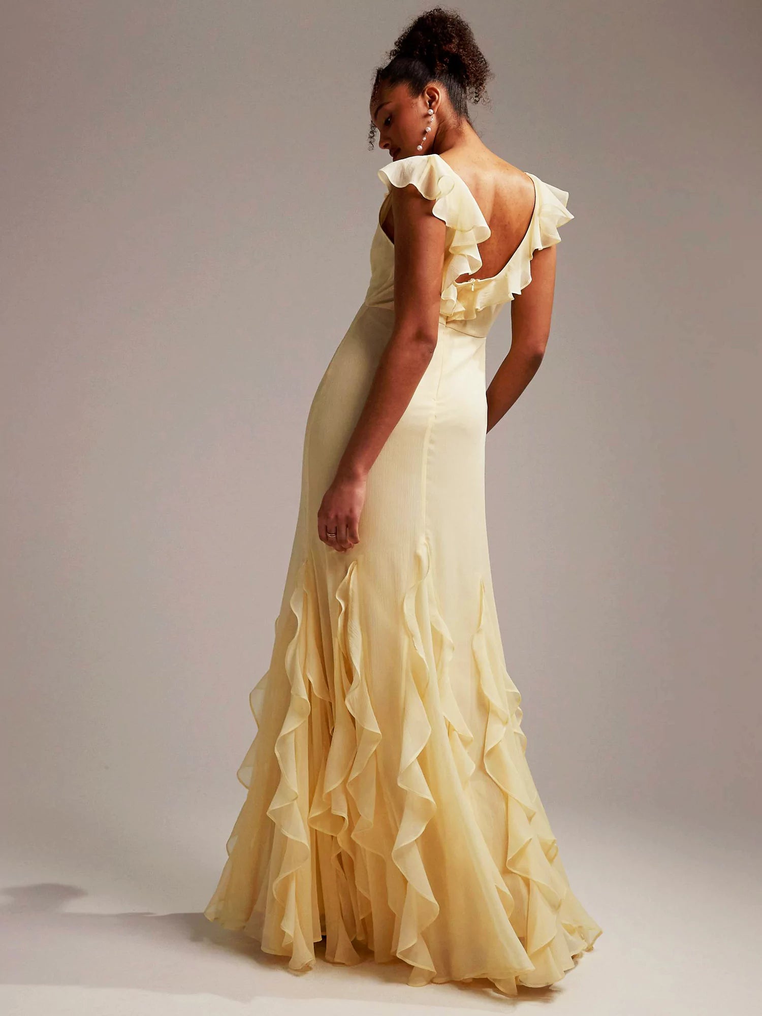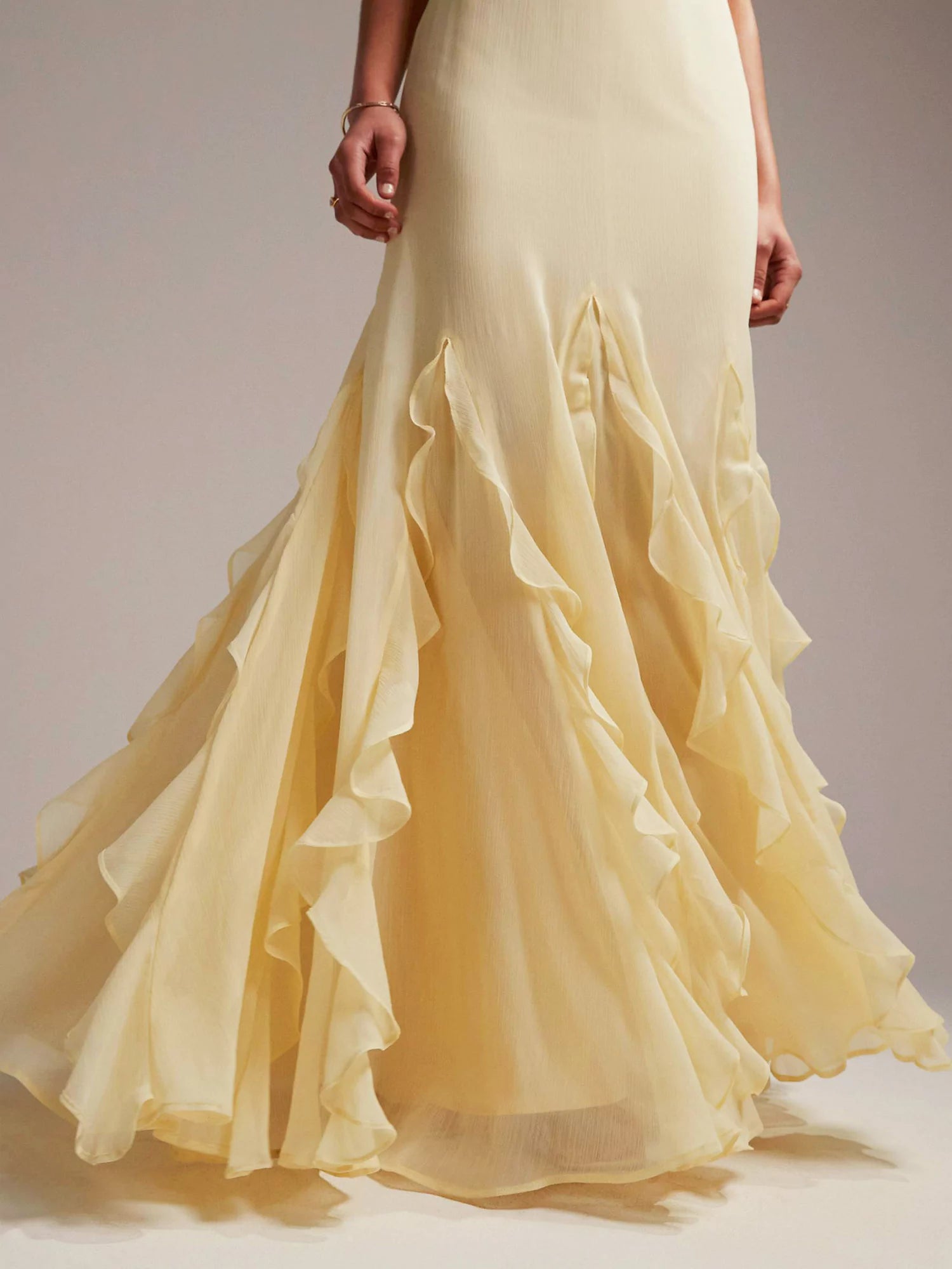 Step into a world of dreamlike elegance with the Radiant Reverie Maxi Dress. This floor-length gown, crafted in a delicate pastel yellow, is designed to captivate with its flowing silhouette and ethereal details. Featuring graceful flutter sleeves and an asymmetric, draped design, the dress is finished with a ruffled hemline that adds a touch of whimsy and sophistication.