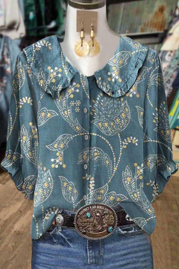 elodieboutique Retro Floral Print Peter Pan Collar Top ID7203NStyle: FashionType: TopMaterial: Cotton BlendPattern Type: Floral PrintSleeve Length: 3/4 SleeveOccasion: CasualPackage Include: 1*TopNote: 1.Please strictly follow the size chart to select the size. Do not select according to your habits.2.The size may have 2-3cm differs due to manual measurement. Please note when you measure.Size(INCH)BustLengthS41.34 25.59 M43.31 25.98 L45.28 26.38 XL48.43 27.17 2XL51.57 27.95 3XL54.72 28.74 35.99