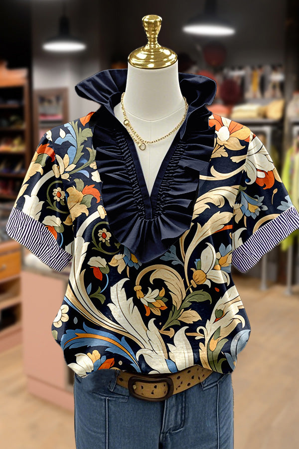 Retro Floral Print Ruffle Neck Striped Short Sleeve Top