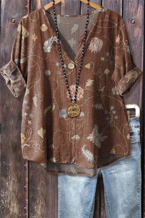 Retro Floral Print V-Neck Top