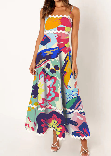 Blue Floral Print Lace Stitching Elegant Strapless Maxi Dress
