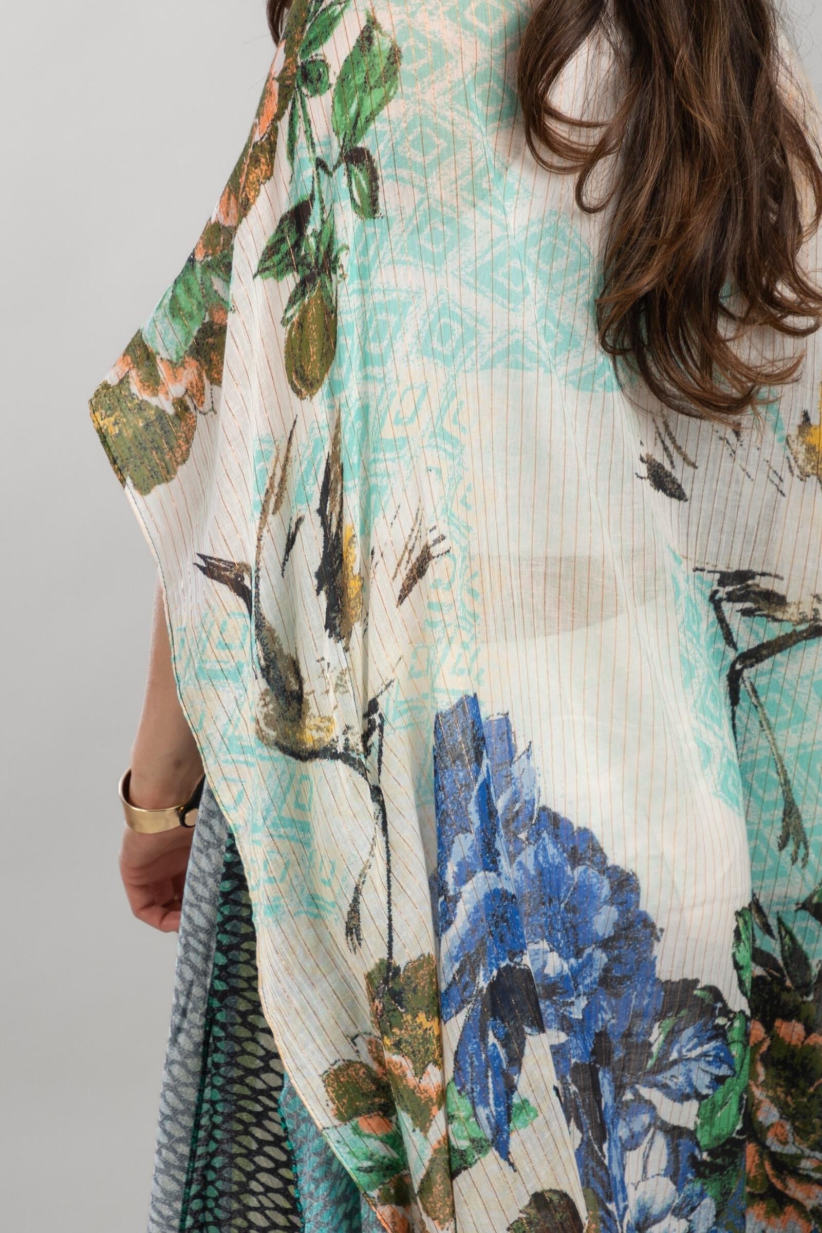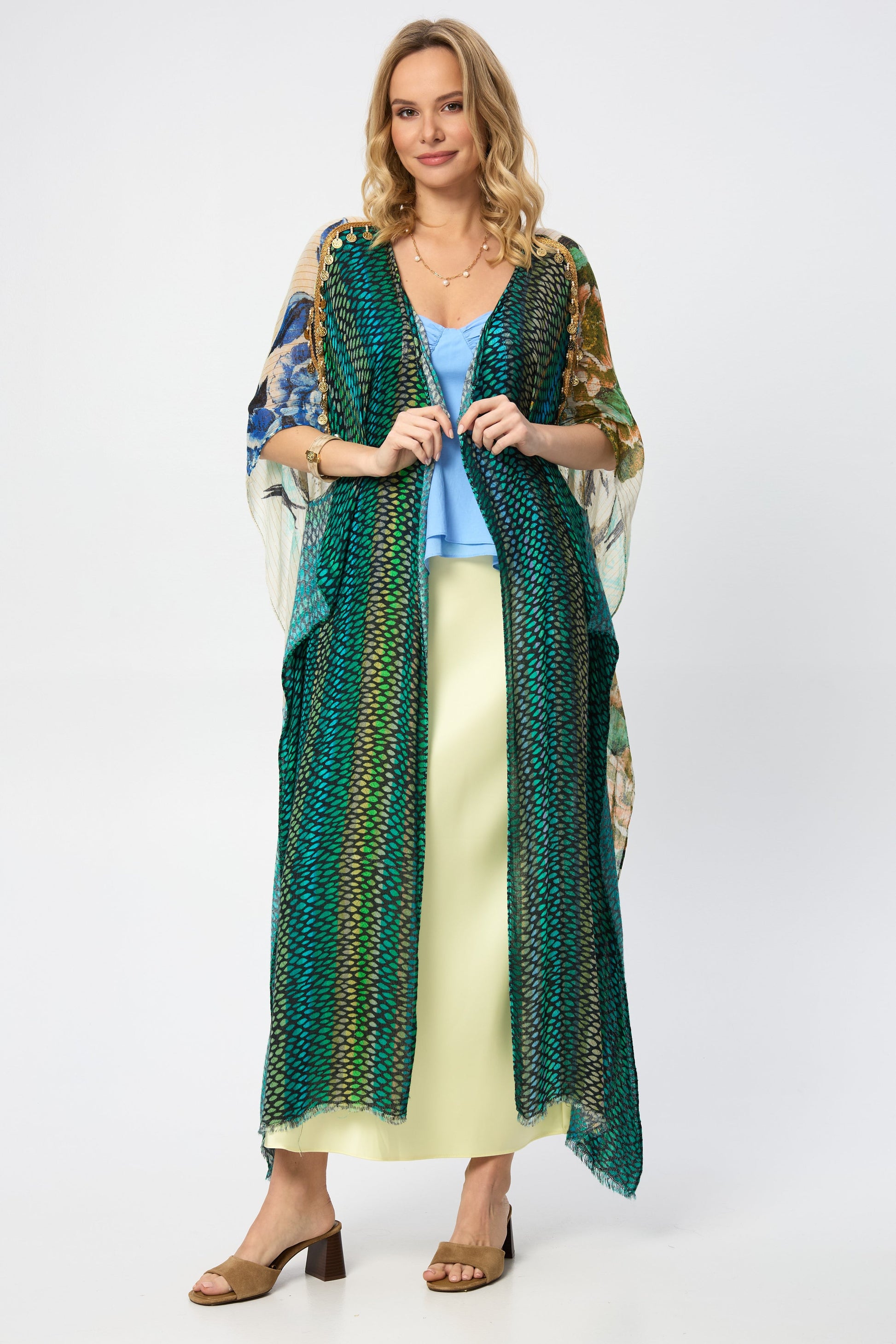Explore the luxury of our Shimmering Floral Print Kimono. The front features a vibrant fish scale pattern, and the back has hints of ikat patterns, fruit, florals, and wildlife. This kimono is a delicate showstopper, incorporating cool and warm tones contrasting against the green front. Add this open-front design to any outfit to make it unforgettable.