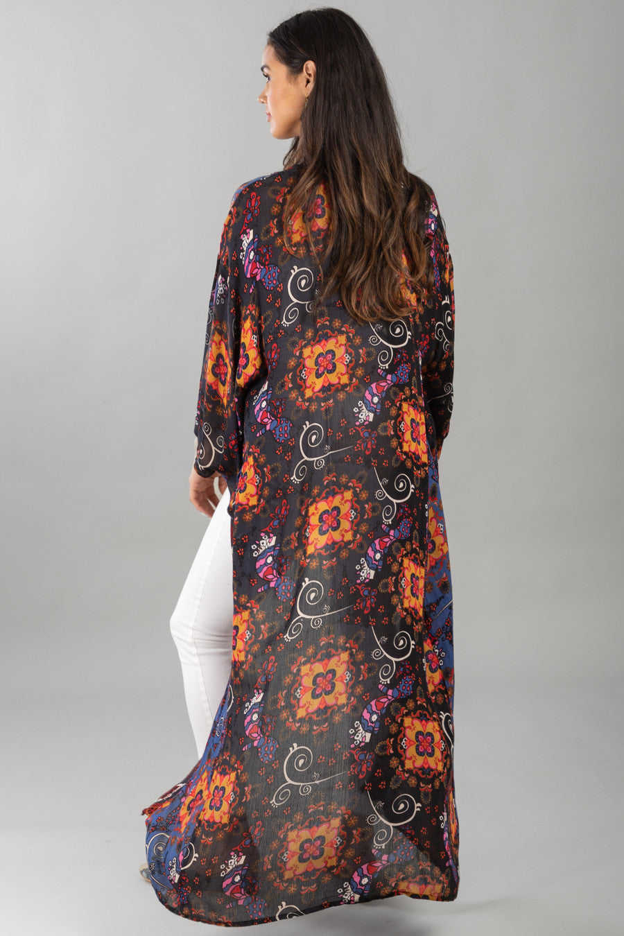 Our Silky Patterned Long Kimono features high-quality fabric for a luxurious feel. This lightweight, ankle-length piece is an excellent layer for warmer weather. This kimono combines comfort with sophistication, perfect for casual outings or evening dates.
