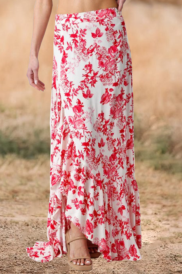 Southern Red Floral Print Ruffled Slit Maxi Skirt
