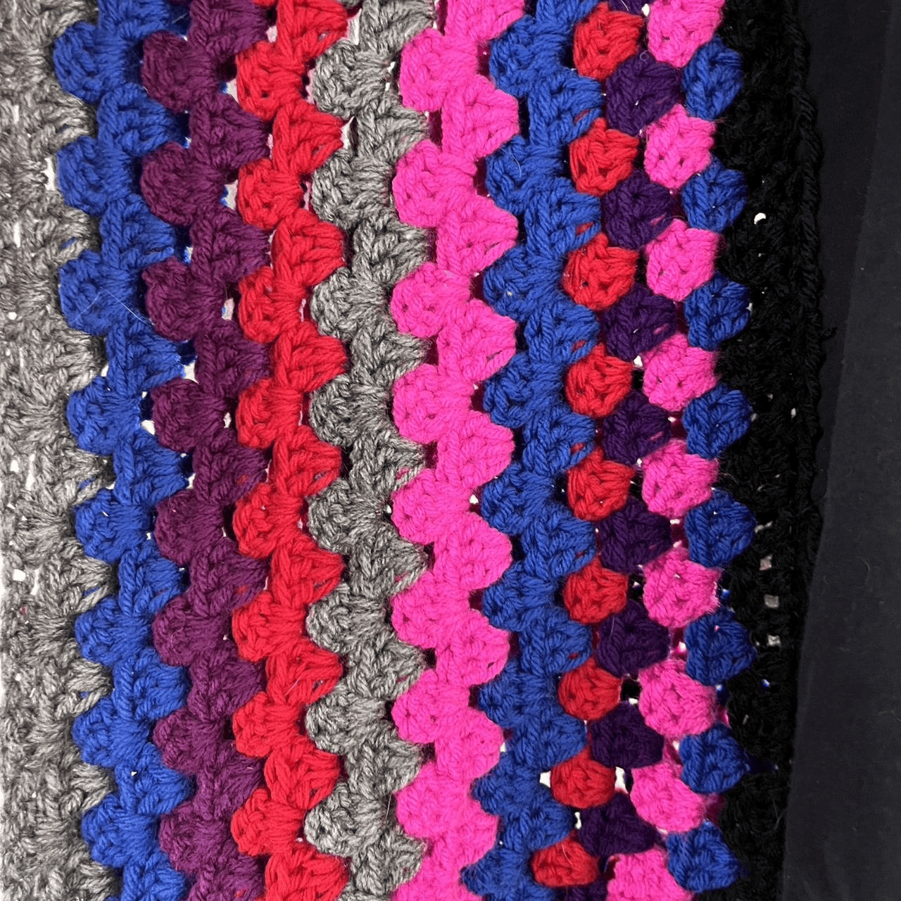 Grey, purple, blue and pink crochet Star Wars t-shirt cape. Handmade, one-of-a-kind item. Vintage T-shirt #StarWars #CrochetFashion #vintage #upcycled Crochet Poncho, Star Wars, handmade, eclectic, colorful, vintage t-shirt, upcycled, one-of-a-kind, statement piece, layering style