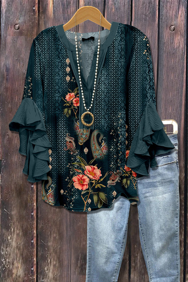 Vintage Floral Print Ruffle Sleeve Top