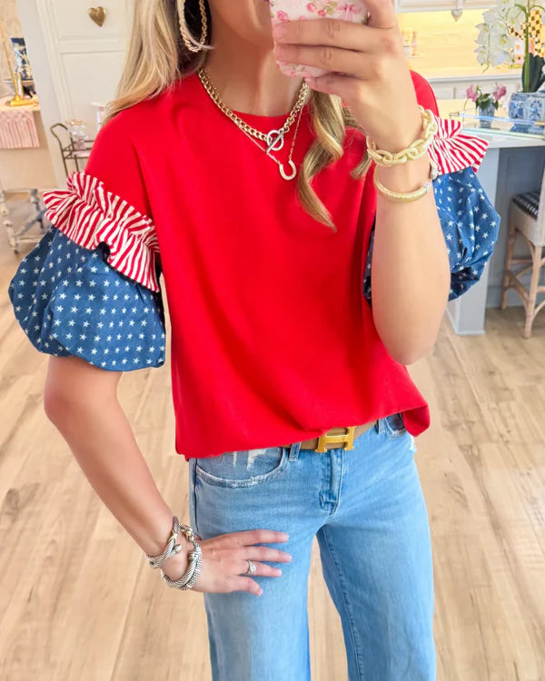 We are glad you clicked our Women's American style puff sleeve top because we really like its casual vibe! The Top design makes it a great choice for any fashion girl.