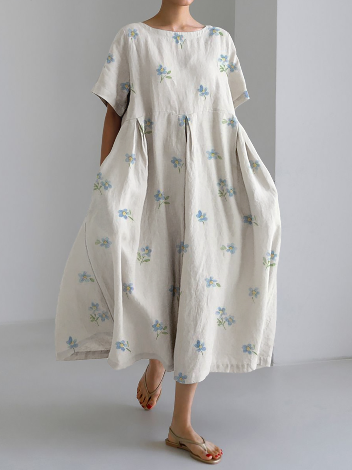 Women's Round Neck Short Sleeve Retro Floral Large Hem Dress Long Skirt